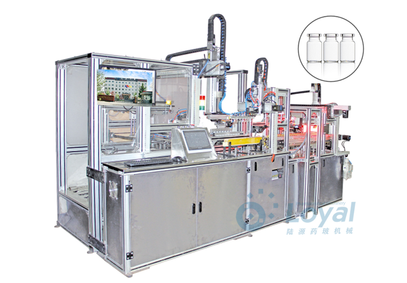 西林瓶生產線包括:自動上管、自動成型、經機械手轉換至前端檢測線(也叫生產管控)、檢測線檢測的項目:1、瓶口內外徑 2、瓶身長短 3、瓶身外徑 4、瓶口邊厚 5、瓶底內凹尺寸檢測;經檢測后的合格品再用機械手夾盤轉換至退火爐網帶上,經高溫減除應力后再降溫,通過氣動吸盤將回火后的小瓶轉換至后端檢測線,后端檢測(也是重檢也叫終檢),經后端拍照檢測項目